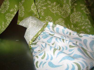 Pokud chceme zástěru dále zdobit, našijeme spodní široké volány. |